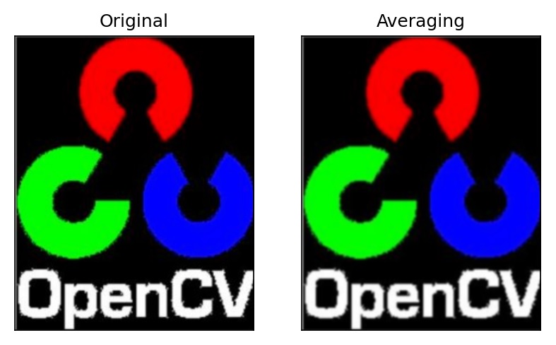 OpenCV cung cấp hàm thực hiện chức năng lọc là cv2.filter2D(). Lấy ví dụ, chúng ta sẽ thử một bộ lọc trung bình trên một hình ảnh. Thao tác như sau: để ma trận bộ lọc trung bình 5x5 trên một pixel, thêm tất cả 25 pixel bên dưới ma trận, lấy giá trị trung bình của nó và thay thế pixel trung tâm bằng giá trị trung bình mới. Tiếp tục thao tác này cho tất cả các pixel trong hình ảnh. Hãy thử đoạn code dưới đây và kiểm tra kết quả: