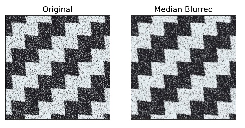 Ở đây, hàm cv2.medianBlur() lấy giá trị trung bình của tất cả các pixel trong vùng và phần tử trung tâm được thay thế bằng giá trị trung bình này. Điều này có hiệu quả cao trong việc chống nhiễu hạt tiêu trong ảnh. Trong các bộ lọc trên, phần tử trung tâm là giá trị mới được tính toán, có thể là giá trị pixel trong ảnh hoặc giá trị mới. Nhưng trong tính năng làm mờ trung vị, yếu tố trung tâm luôn được thay thế bằng một số giá trị pixel trong hình ảnh. Nó làm giảm nhiễu một cách hiệu quả. Kích thước ma trận nhân của nó phải là một số nguyên dương lẻ. Để thực hiện, thay thế hàm sau vào đoạn code ở Mục 1: